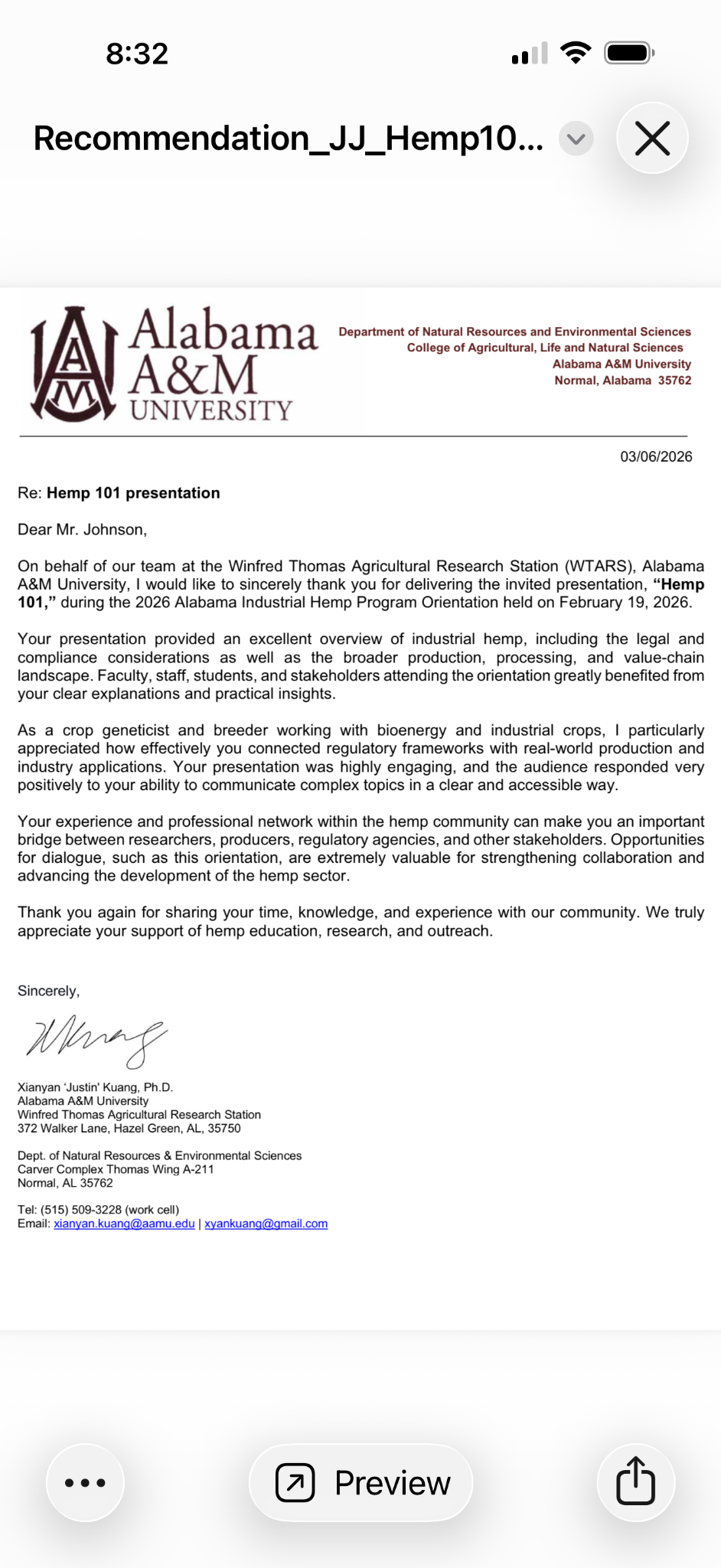 Letter recognizing JJ’s invited Hemp 101 presentation during the Alabama Industrial Hemp Program Orientation and its value to faculty, students, and stakeholders.