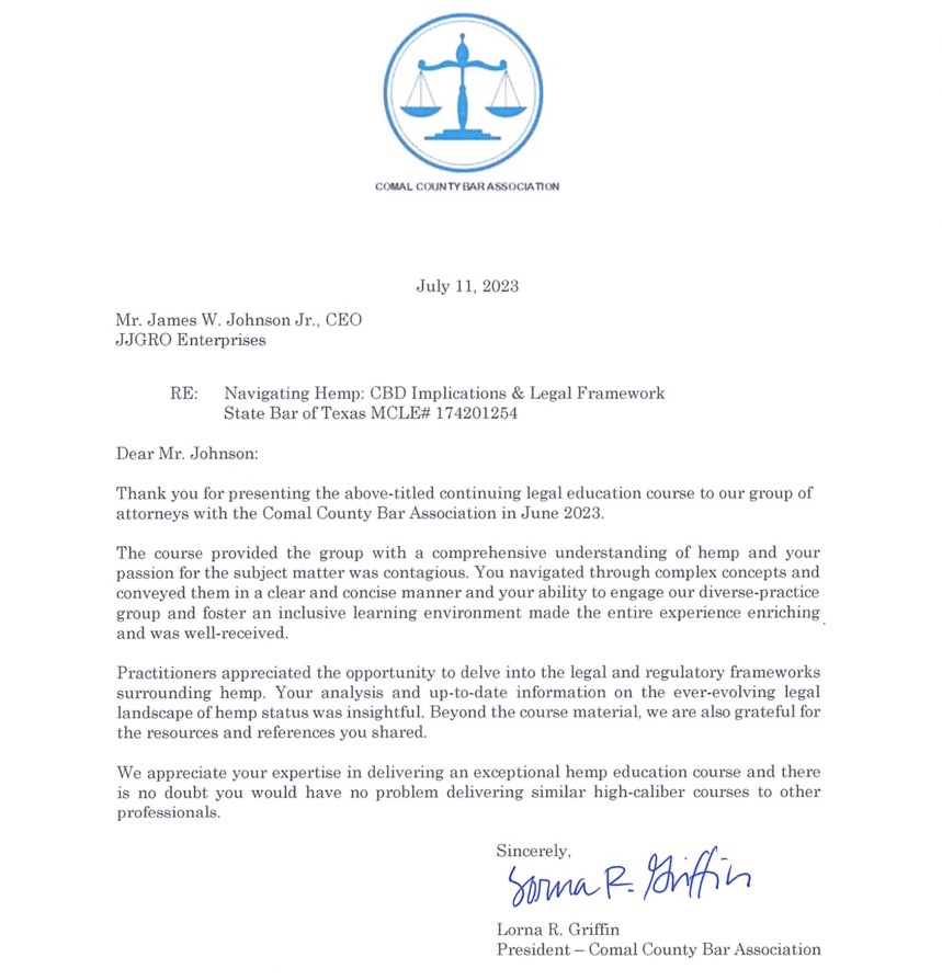 Professional acknowledgment of JJ’s continuing legal education presentation on hemp, CBD implications, and legal frameworks.