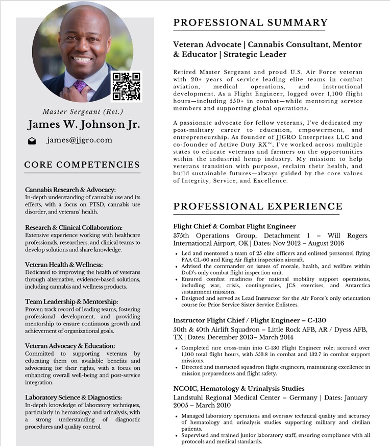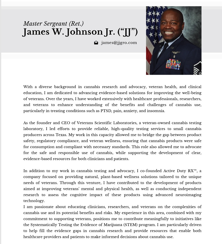 Master Sergeant (Ret.), veteran advocate, cannabis and hemp consultant, educator, and strategic leader with a background spanning military service, laboratory science, cannabis education, entrepreneurship, and public-facing hemp advocacy.
