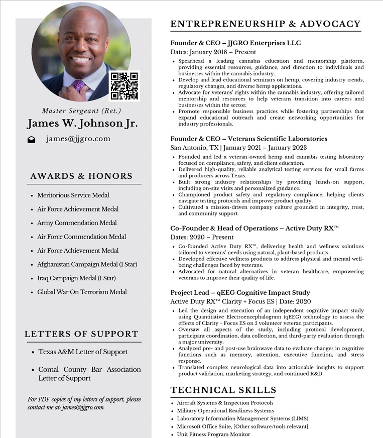 This page brings together JJ’s professional profile, military background, seminar work, and third-party letters recognizing his Hemp 101 presentations and educational leadership.