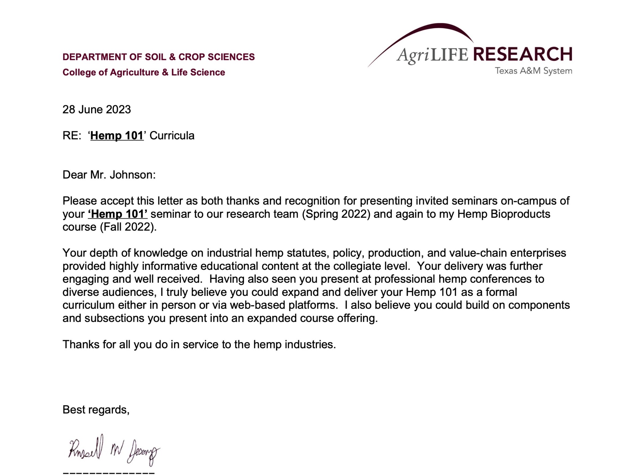 Recognition for presenting Hemp 101 seminars and delivering collegiate-level content on industrial hemp statutes, policy, production, and value-chain enterprises.